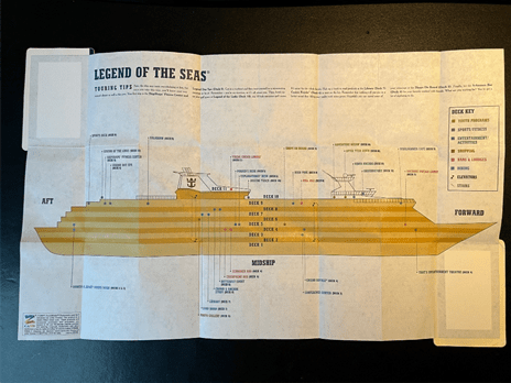 The ship was the Legend of the Seas: built in 1995, GT 69,130, length 240.20 m, cabins 900, crew 720, Royal Caribbean International, Vision class, Vmax. 44 km/h).